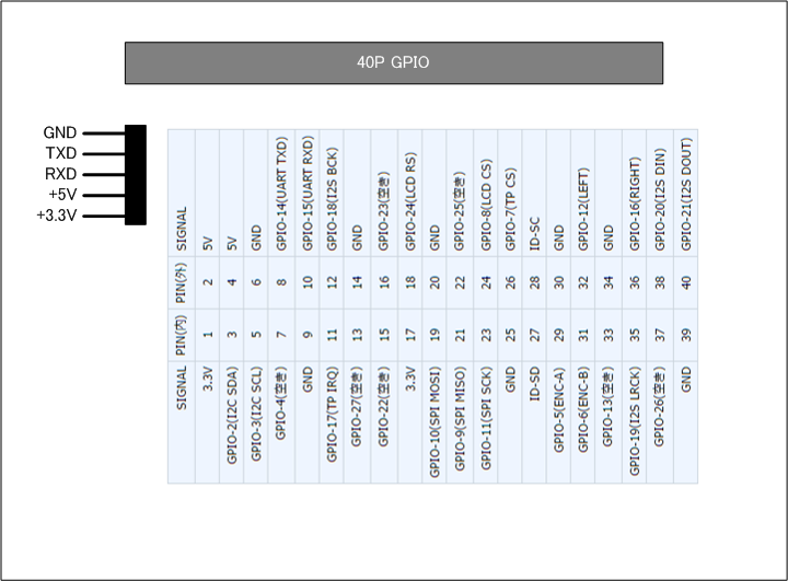 | GPIO-17(TP IRQ) | 11 | 12 | GPIO-18(I2S BCK) |