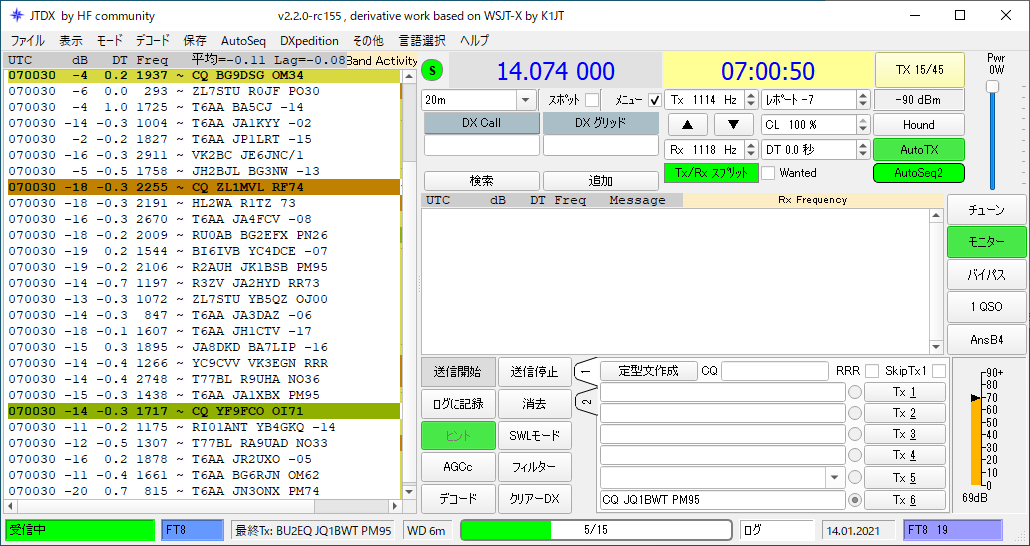 - Tx6に「CQ JQ1BWT PM95」と入れる(内容は各自に合わせること)