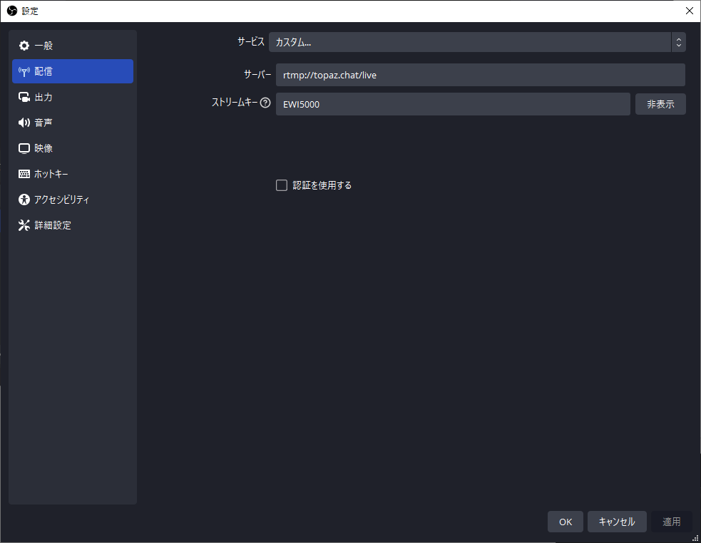 - URLに rtsp://topaz.chat/live/[ストリームキー]