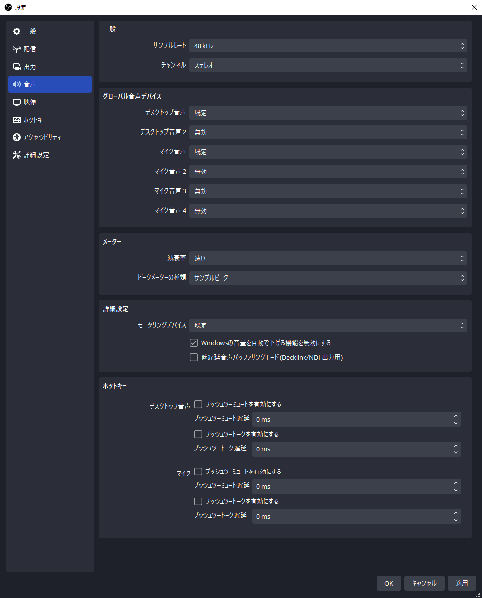 - 具体的にはOBSのレベルメーターにて、ピーク(最大音量)で-10dBを超えない範囲