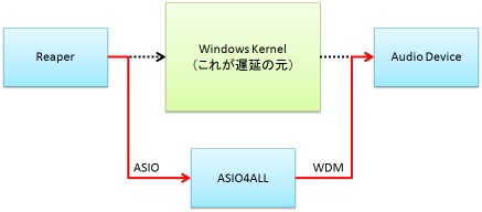 ASIO準拠アプリ→(ASIO)ASIO4ALL(WDM)→WDMサウンドチップ→出力