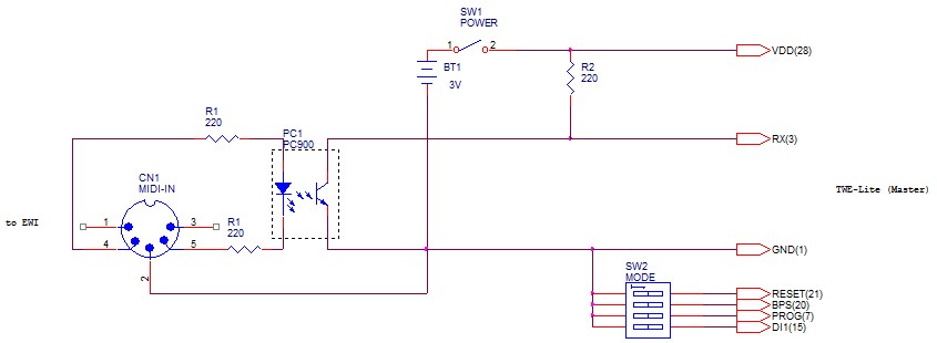 - TWI-LiteのTX端子をそのまま出力(MIDI-5pinへ)