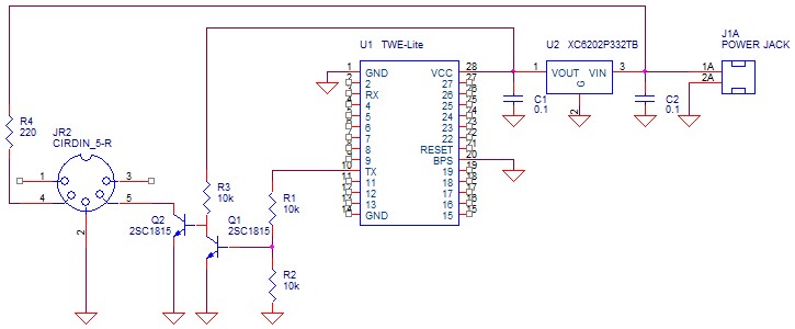 - 出力側は220ΩでVcc=3.0VにプルアップしてTWI-LiteのRXに接続